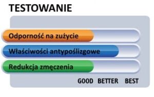 - Antypoślizgowość: R10 wg DIN51130 i BG-rule BGR181