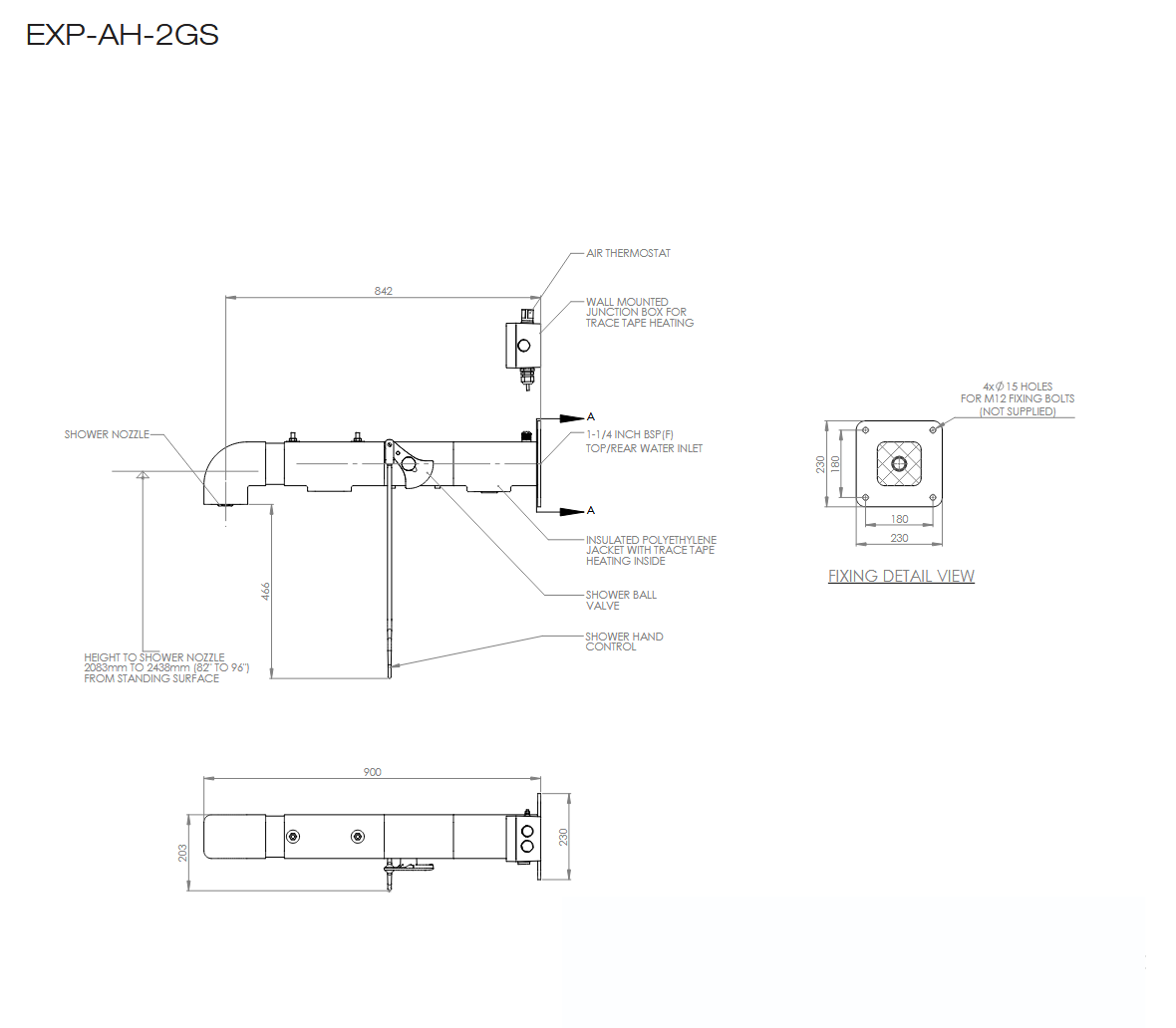 Podgrzewany i izolowany montowany na ścianie prysznic bezpieczeństwa przeznaczony do użytku w miejscach, w których istnieje ryzyko zamarznięcia wody. Nadaje się do zastosowań w miejscach zagrożonych wyciekiem substancji niebezpiecznych jak również obszarów niebezpiecznych.