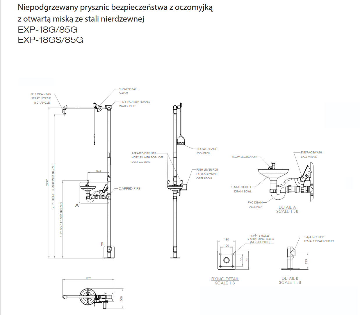 Aby zwiększyć odporność na korozję, myjka do oczu jest wykonana ze stali nierdzewnej i wyposażona w osłony chroniące dysze przed kurzem i zanieczyszczeniami. Jest to zgodne z wymogami dla pryszniców bezpieczeństwa z myjkami do oczu i twarzy, zarówno w normie EN15154, jak i ANSI Z358.1-2014.
