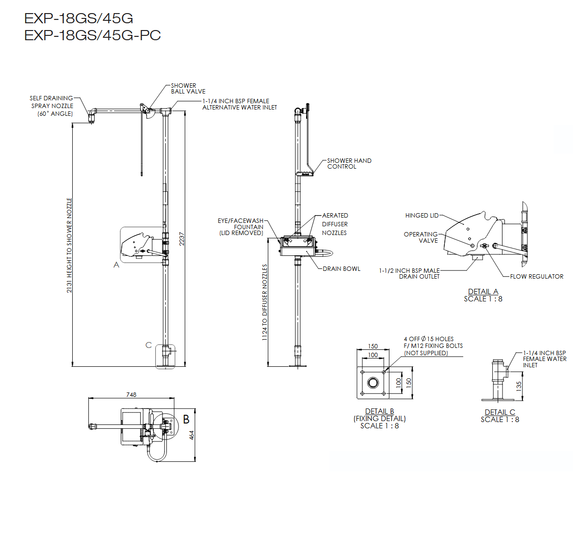 Montowany do podłogi nieogrzewany prysznic bezpieczeństwa z myjką do oczu/twarzy – pokrywa ABS. Model zgodny z normą ANSI, idealny do zastosowań wewnętrznych, w których nie występuje ryzyko zamarzania lub przegrzania. Prosta aktywacja prysznica bezpieczeństwa za pomocą uchwytu, aktywacja oczomyjki przez opuszczenie pokrywy. Prysznic dostarcza zalecane przez ANSI 76 litrów wody pitnej na minutę i 12 litrów na minutę do przemywania oczu/twarzy. Dostępny wykonanie ze stali ocynkowanej lub ze stali nierdzewnej 316L.