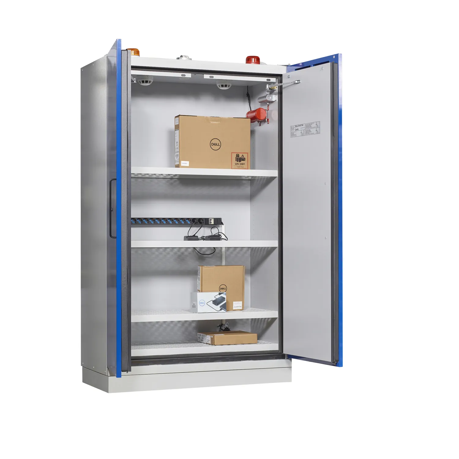 Szafa na akumulatory litowo-jonowe Justrite EN jest wyposażona w najnowszą technologię bezpieczeństwa, aby zapewnić pełną ochronę personelu i mienia przed potencjalnymi zagrożeniami związanymi z przechowywaniem, obsługą i ładowaniem akumulatorów litowo-jonowych. Testy ogniowe zgodne z najbardziej rygorystycznymi normami międzynarodowymi, takimi jak EN 14470-1, potwierdzają, że szafa spełnia wszystkie wymagania przeciwpożarowe, aby działać jako bariera bezpieczeństwa chroniąca przechowywane akumulatory litowo-jonowe przed przegrzaniem w wyniku pożaru zewnętrznego przez co najmniej 90 minut, zapobiegając samozapaleniu się baterii, utracie stabilności lub wybuchowi. Dzięki 3 modelom, w 2 różnych rozmiarach i szerokiej gamie akcesoriów, w tym gniazdek i alarmowi bezpieczeństwa, szafy na baterie litowe pozwalają na dostosowania aktywnego lub pasywnego rozwiązania do przechowywania baterii litowo-jonowych.
